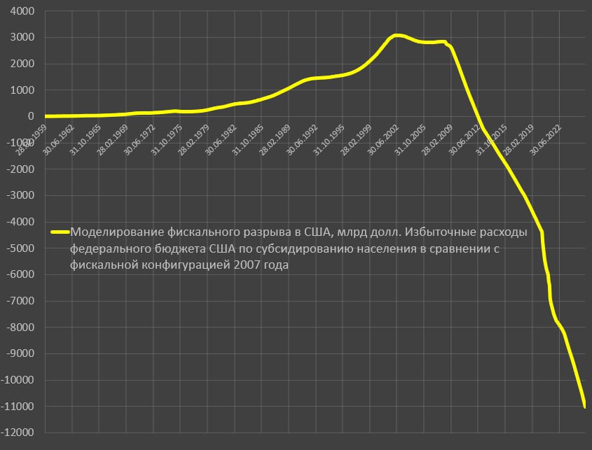 Этот разрыв можно привести в денежном выражении. Если бы с 2008 по 2025 уровень фискального стимулирования был в среднем на уровне 2007, это привело бы к экономии … внимание – 14 трлн долларов за 17 лет (моделирование фискального разрыва приведено на графике).