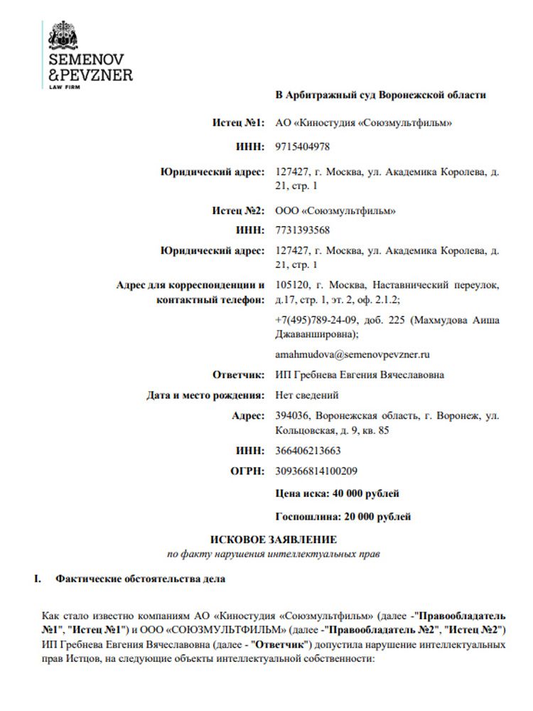 В арбитражный суд Воронежской области поступил иск от компаний «Киностудия Союзмультфильм» и «Союзмультфильм» к индивидуальному предпринимателю Евгении Гребневой, известному воронежскому волонтёру. Истцы требуют наказать девушку за нарушение авторских прав в отношении Чебурашки — персонажа известного советского мультика про Чебурашку и крокодила Гену.