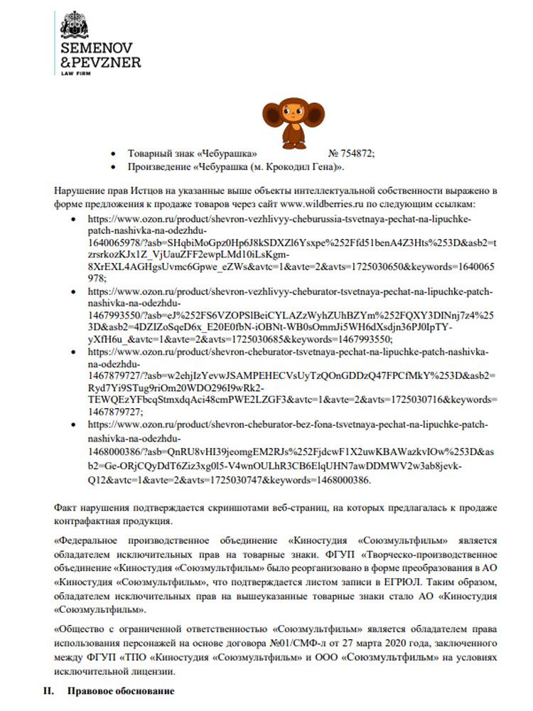А незадолго до Нового года девушку огорошили: за нарушение авторских прав «Союзмультфильм» будет с ней судиться. Поводом стали шевроны с изображением Чебурашки, которые, как было написано в иске, ИП Евгения Гребнева предложила к продаже через сайт одного из маркетплейсов.