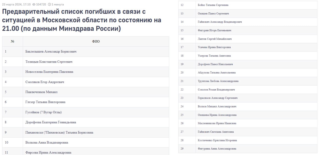 ❗️МЧС расширило поименный список погибших в «Крокусе» — теперь в нем 29 человек