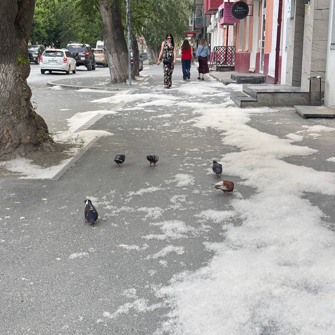 Дороги, деревья и даже дома в городе покрыты слоем пуха. Выглядит, конечно, атмосферно, но горожане-аллергики плачут, коммунальщики — тоже.