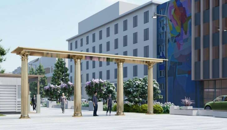 В следующем примере власти уже ближе подошли к реальному назначению архитектурных проемов. Планы по превращению Театральной в пешеходную улицу, конечно, заслуживают уважения, но вот отдельные решения вызывают вопросы. По задумке чиновников, на входе в уфимский Арбат будет стоять декоративная арка (на самом деле в этом случае это просто колоннада, но ладно), и в этот раз ее додумались не устанавливать посреди великого Ничего. Только обратите внимание на ее выбивающийся облик – она имеет золотистый цвет, что напоминает о лучших традициях популярного в России стиля «дорохо-бохато». Вот как один неудачный элемент может испортить вполне хорошую задумку.