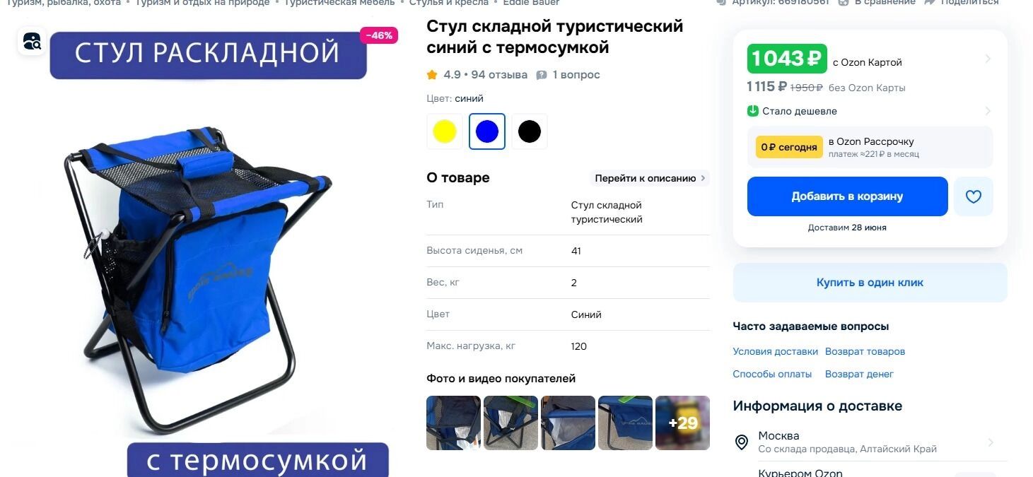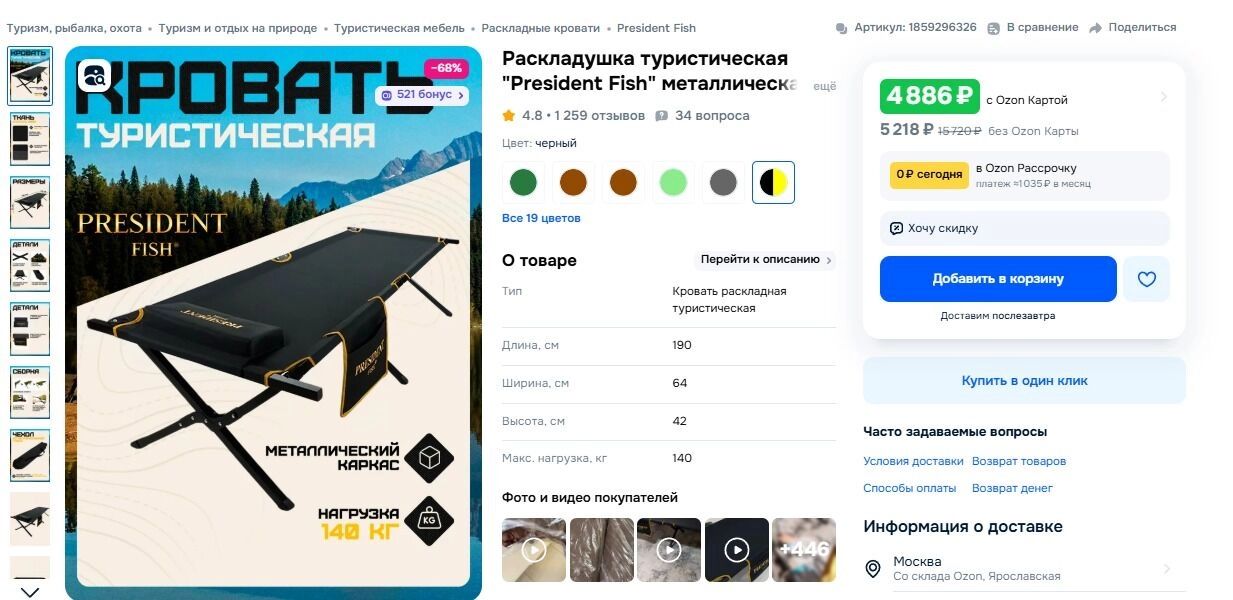 «Качество хорошее, ткань надёжная, натяжка полотна отличная. Вернул из-за брака на ткани — магазин без проблем принял обратно, за это отдельное спасибо. Хотя товар не лёгкий, и вся логистика по возврату отнимает средства — всё равно решили вопрос. Сразу заказываю снова эту же раскладушку!»