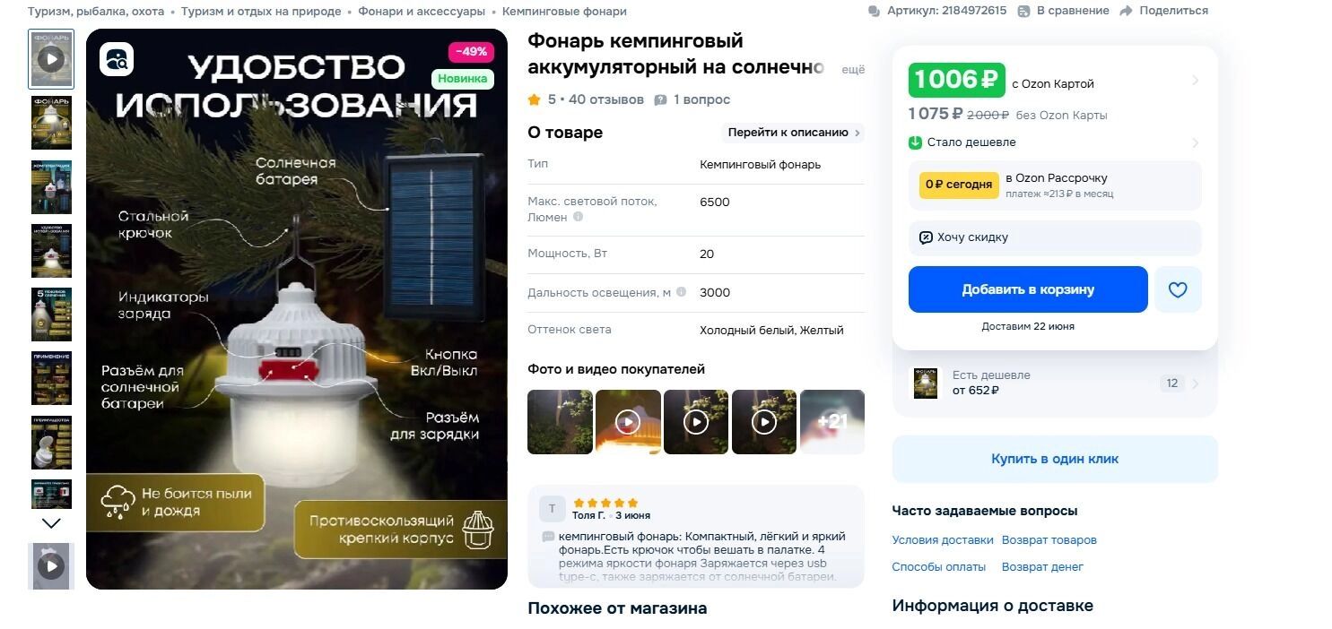 «Компактный, лёгкий и яркий фонарь. Есть крючок, чтобы вешать в палатке. 4 режима яркости. Заряжается через USB Type‑C, также от солнечной батареи. Свет приятный и не слепит. На сколько хватает — пока не проверял, но он и не нужен для долгого освещения».