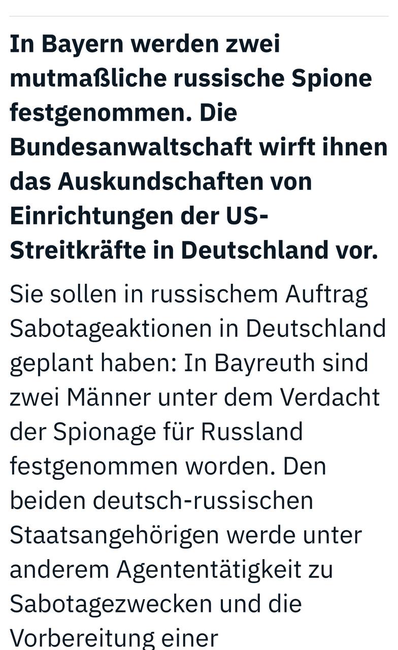 Вот и подробности. В Байройте двое мужчин были арестованы по подозрению в шпионаже на Россию. Два немецко-российских гражданина обвиняются в агентской деятельности с целью саботажа и подготовки диверсии , сообщает Федеральная прокуратура в Карлсруэ.