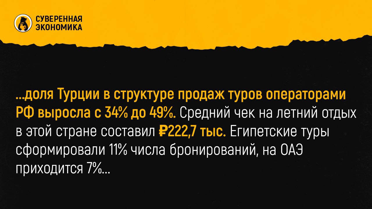 Куда едут любители All Inclusive — доля Турции среди поездок россиян выросла почти на половину Россияне стали заранее бронировать летние туры. Продажи поездок операторами увеличились на 20-50%, а системы бронирования отчитываются о кратном росте год к году. По статистике Trаvelata, число туров на апрель-октябрь выросло в 2,1 раза. В «Слетать.ру» спрос увеличился в четыре раза. Fun&Sun планирует продать 2,5 млн туров против 1,9 млн годом ранее. Снижение цен на отдых в Турции привело к росту бронирования путевок в эту страну. Согласно Travelata, доля Турции в структуре российских продаж выросла с 34% до 49%. Средний чек на летний отдых в этой стране составил ₽222,7 тыс. Египетские туры сформировали 11% числа бронирований, на ОАЭ приходится 7%. Продажи отечественных путевок увеличились на 30%. Причины такого роста — инфляционное давление и дефицит номеров в популярных регионах.