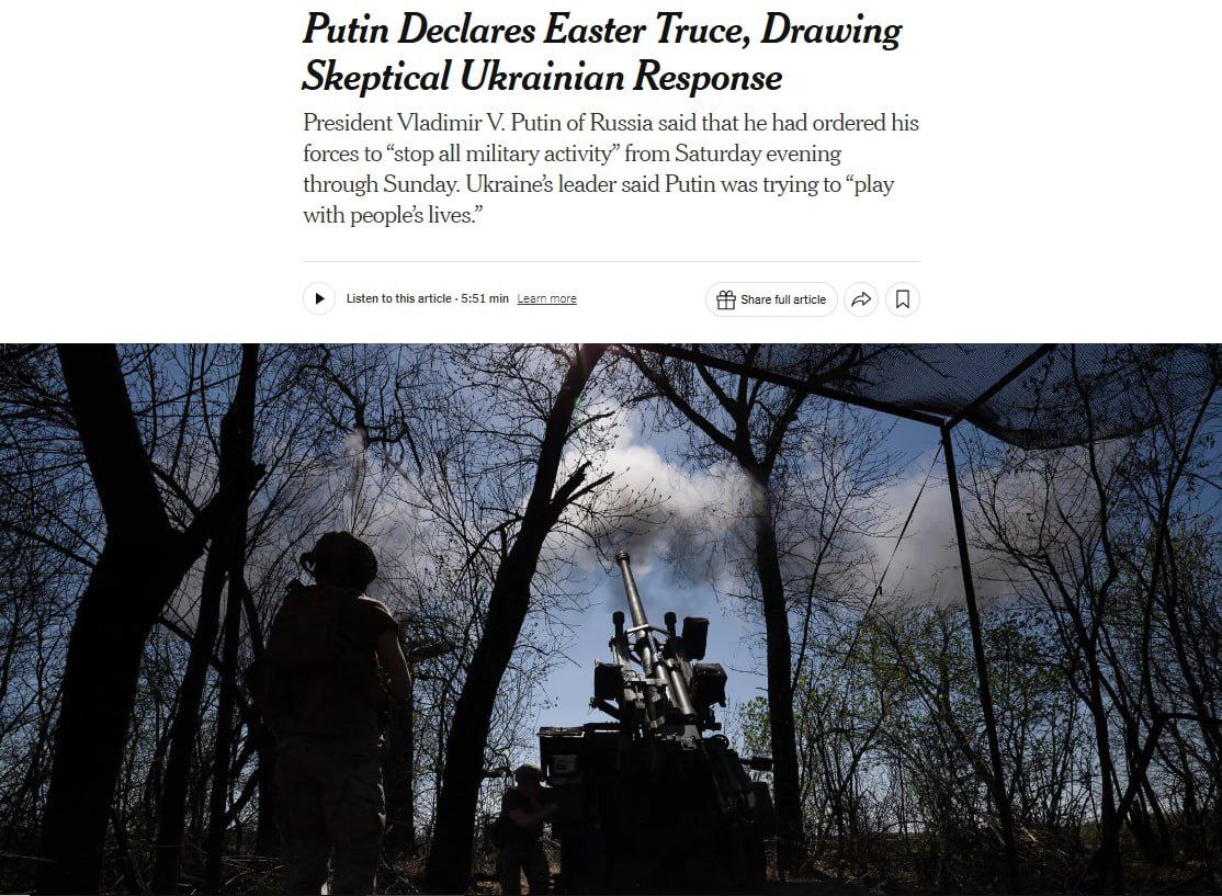 Россия продемонстрировала открытость к переговорам, объявив пасхальное перемирие, пишет газета The New York Times.