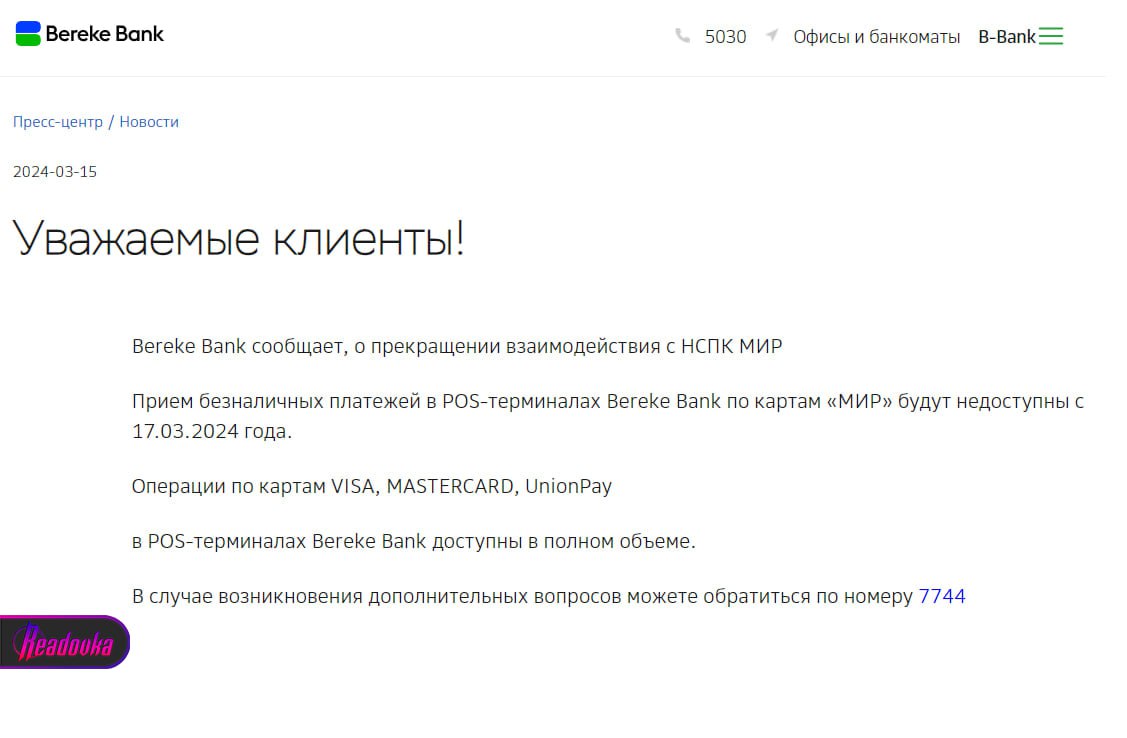 Бывшая «дочка» Сбербанка в Казахстане объявила о прекращении операций по картам «Мир» Еще один казахстанский банк отказался от обслуживания карт «Мир». Вероятная причина такого поведения финансовых институтов этой страны в том, что они прогнулись под давлением США, которые продолжают разбрасываться санкциями налево и направо в надежде запугать Россию. Так, казахстанский Bereke Bank, ранее являвшийся дочерней компанией Сбербанка, объявил о прекращении взаимодействия с оператором платежной системы «Мир». На сайте кредитной организации висит объявление, согласно которому прием безналичных платежей по картам «Мир» будет недоступен с 17 марта 2024 года, то есть с завтрашнего дня. При этом операции по картам Visa, Mastercard, UnionPay будут доступны в полном объеме.