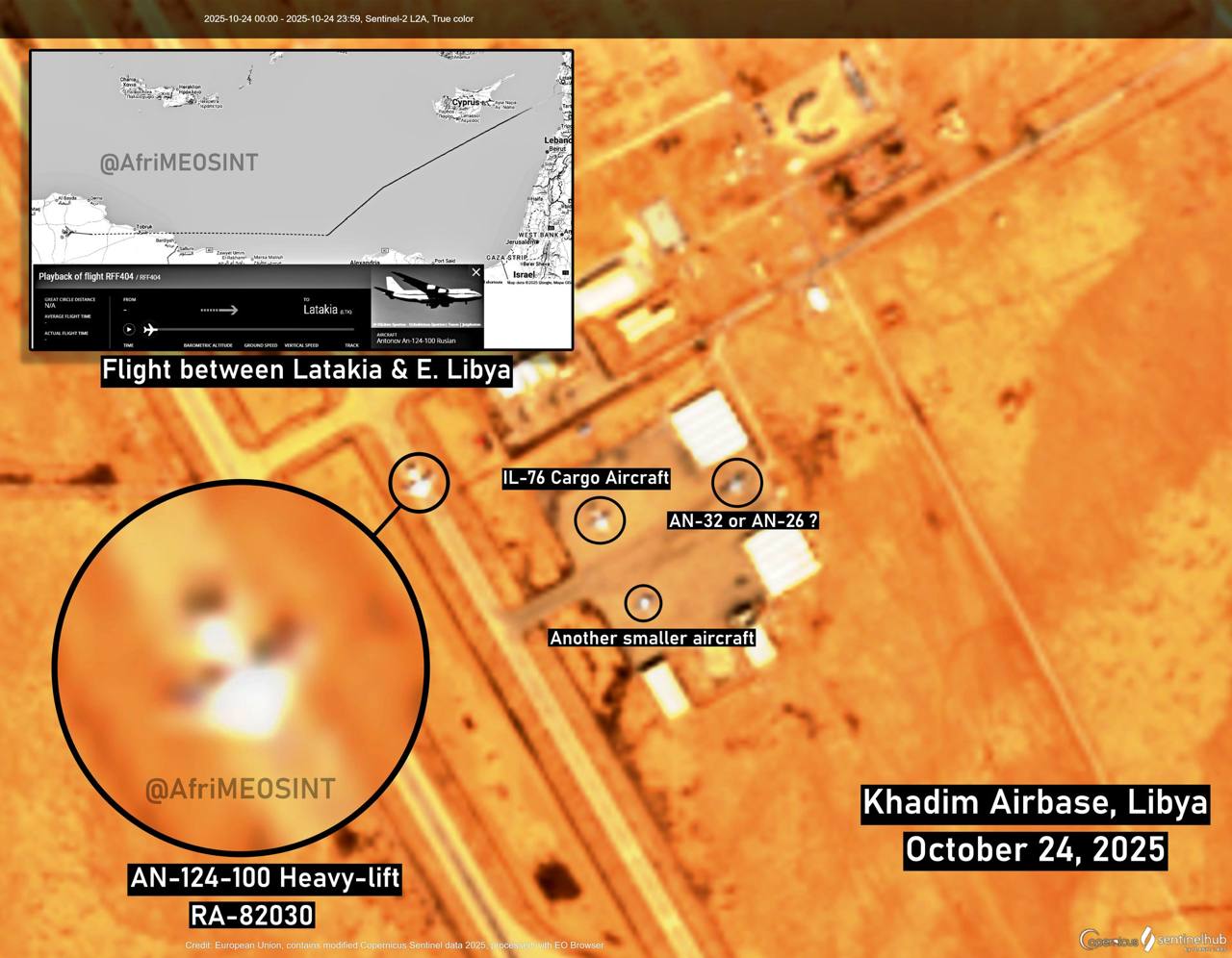 Тяжёлый транспортный самолёт Ан-124-100 ВКС России (рег. номер RA-82030) совершил не менее двух перелётов с авиабазы Хмеймим в Латакии на авиабазу Хадим в Ливии.