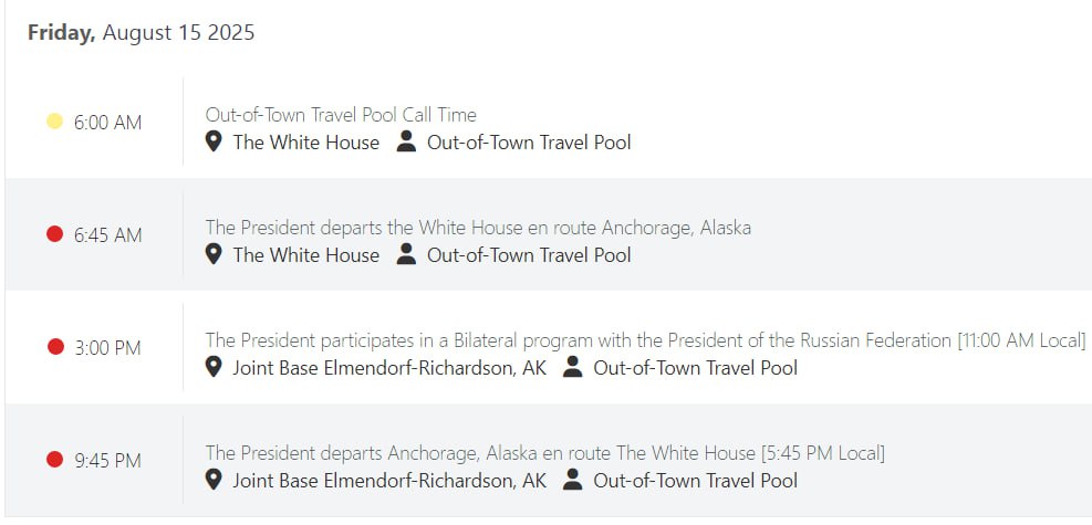 График президента США Дональда Трампа на пятницу 15 августа 2025 года (указано московское время):