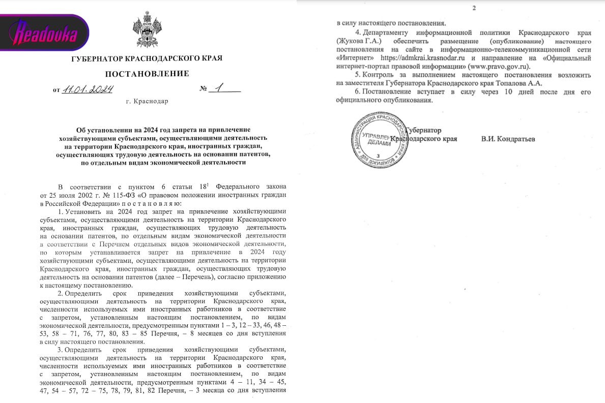 В Краснодарском крае продлили на 2024 год запрет на трудоустройство мигрантов по патентам — в регионе под запретом 85 сфер деятельности для иностранцев Краснодарский край отличился ограничениями, которые ввел на трудоустройство иностранных граждан по патенту — так, в регионе продлен полный запрет на 85 видов экономической деятельности, следует из подписанного губернатором постановления. В перечне запрещенных сфер самые разные профессии — от здравоохранения до ремонта транспорта. За несоблюдение установленных ограничений предусмотрен штраф для работодателя в размере до ₽1 млн за каждого иностранного гражданина. Ограничение продлевается уже третий год подряд, постановление на этот вступит в силу 21 января. Исключением для запрещенных сфер для трудоустройства традиционно служит строительная сфера, в регионе уже второй год доля иностранных специалистов достигает 50%. По данным властей, мера направлена на защиту национального рынка труда и необходимости в приоритетном порядке трудоустройства граждан России.