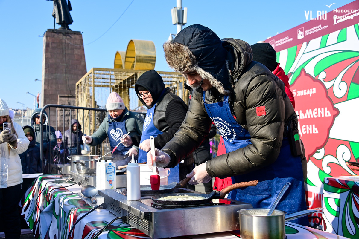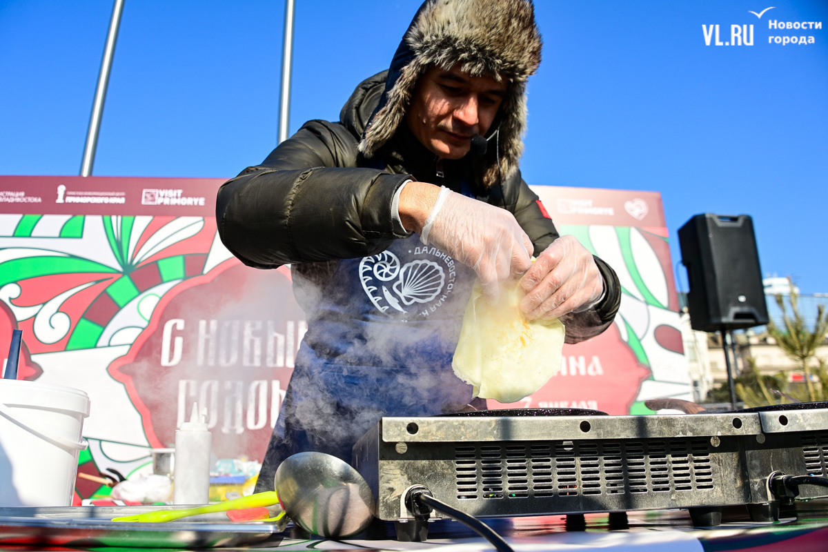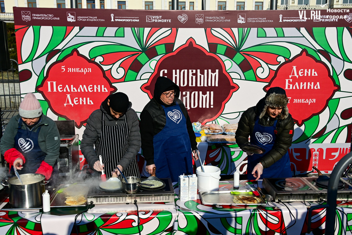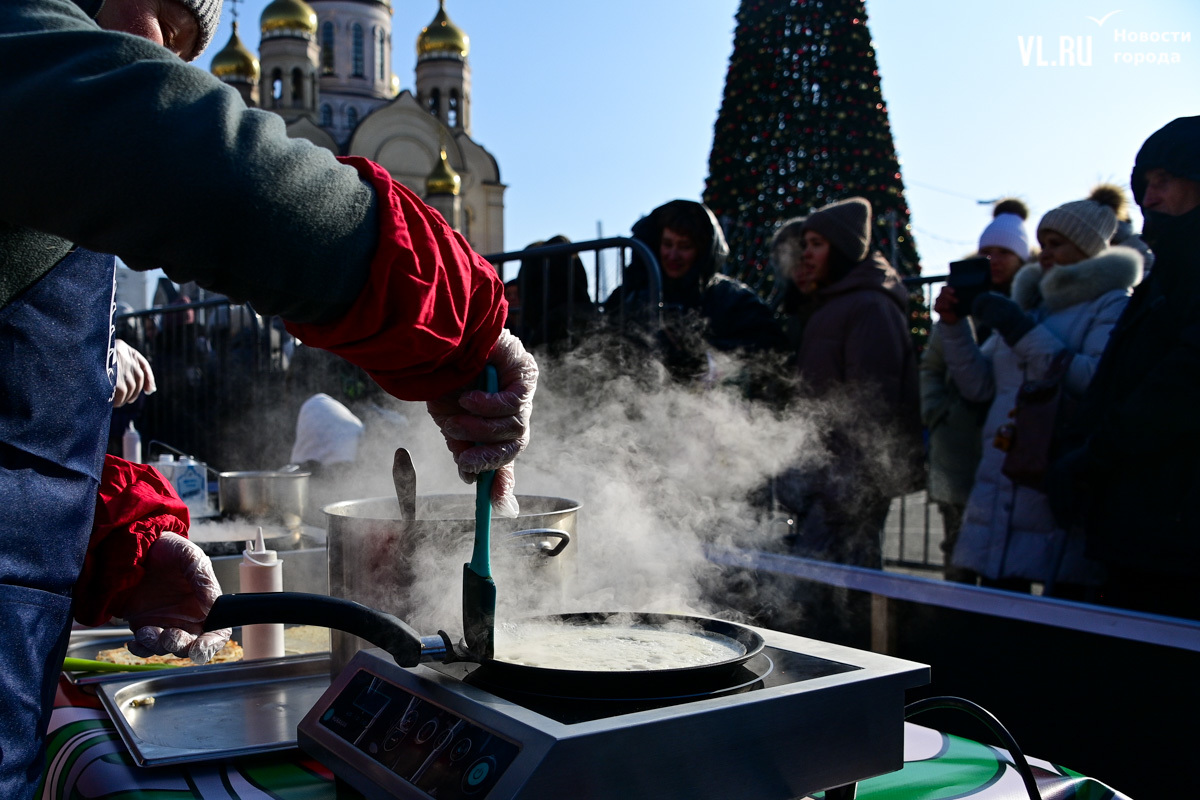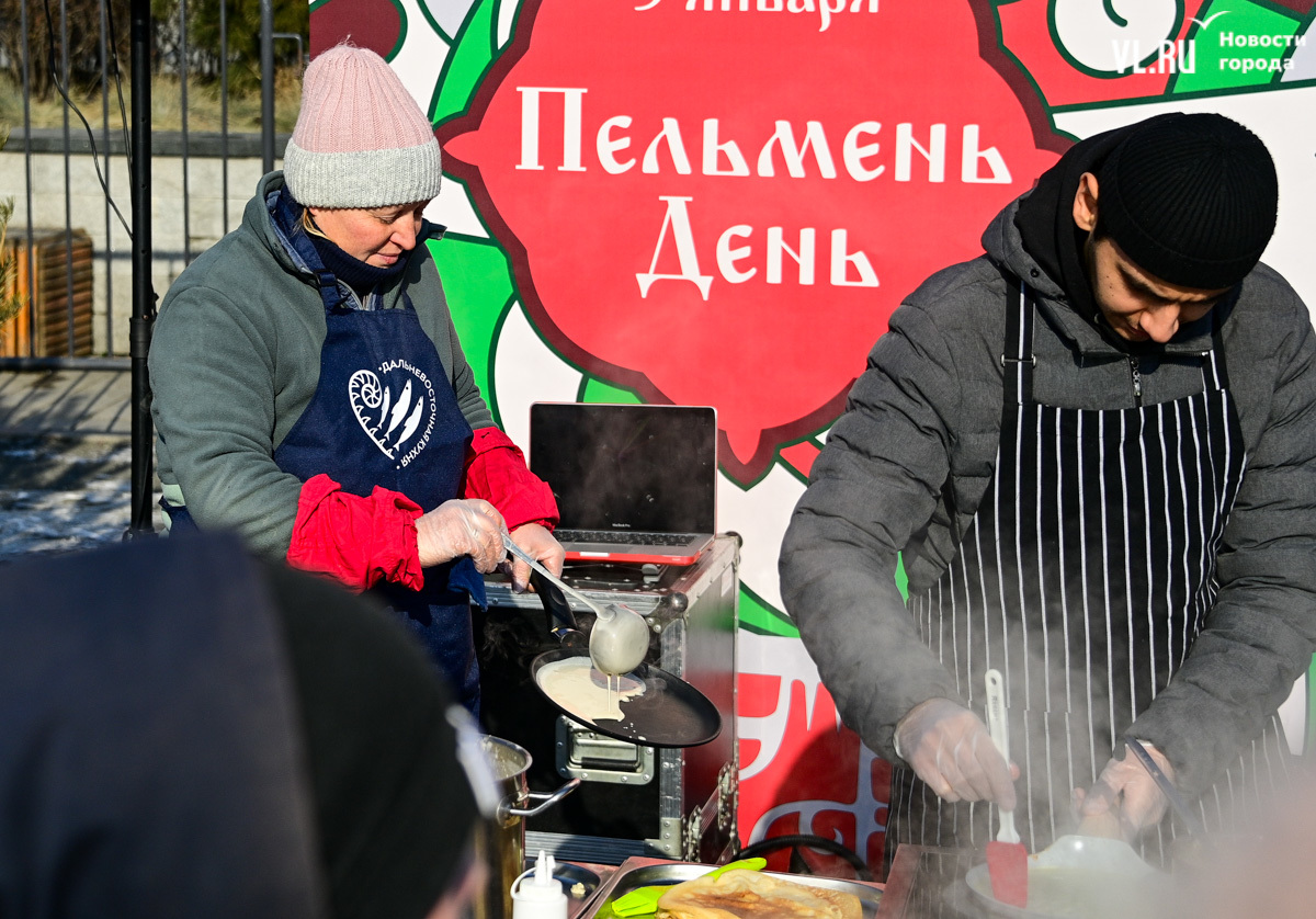 «У нас будет около тысячи порций. И по максимуму желающих должно хватить обязательно. Празднуем дальше вступление в Новый 2025 год. До масленицы нам ещё далеко, такой разогревчик перед масленицей – Visit Primorye решил устроить вот такое событие. А почему бы и нет? Потому что пельмени – это такое традиционное блюдо на новогоднем столе. А блины любят в нашей стране не только на масленицу. Кто не любит блины? Наверное, не найдется такого человека. Желающих очень много», – говорил один из ведущих, семенящий между поварами с гигантскими тарами жидкого теста.