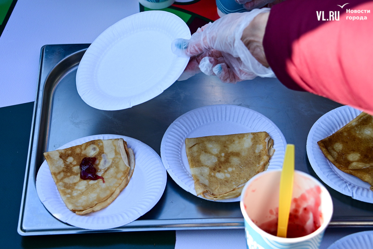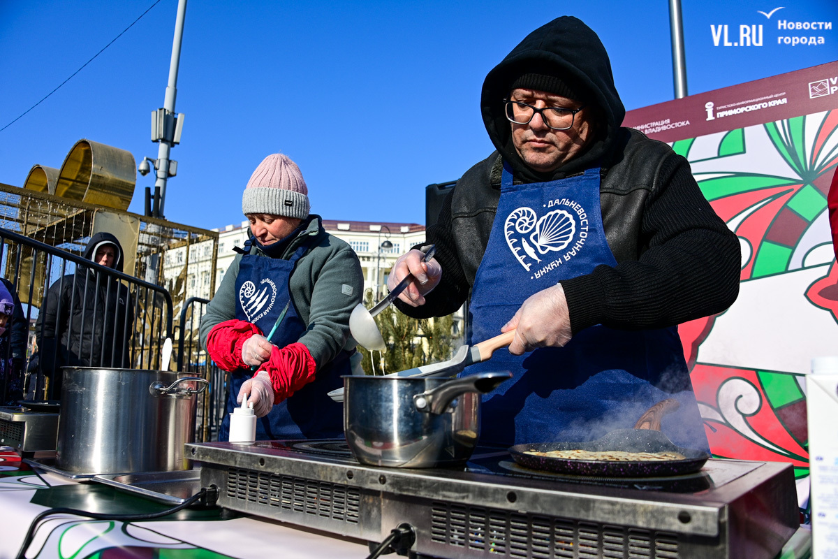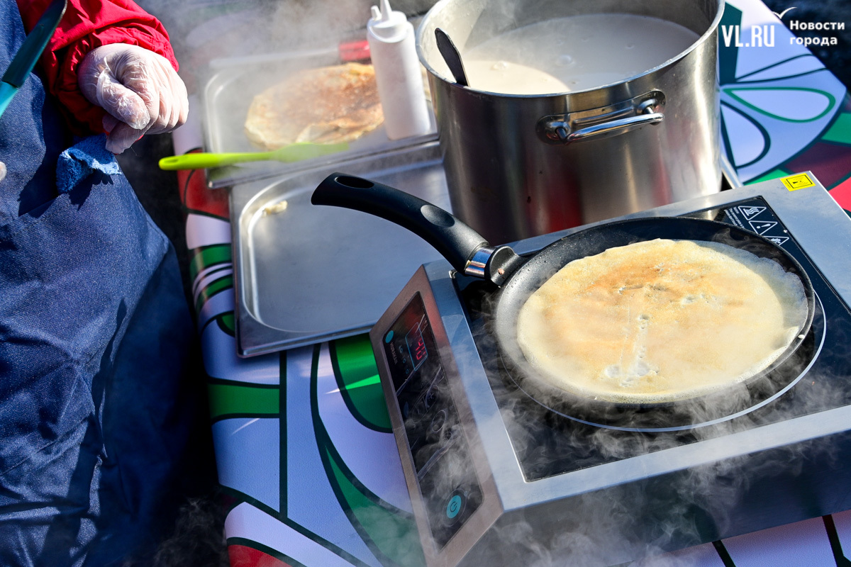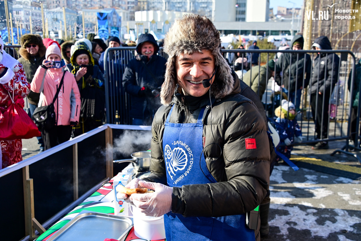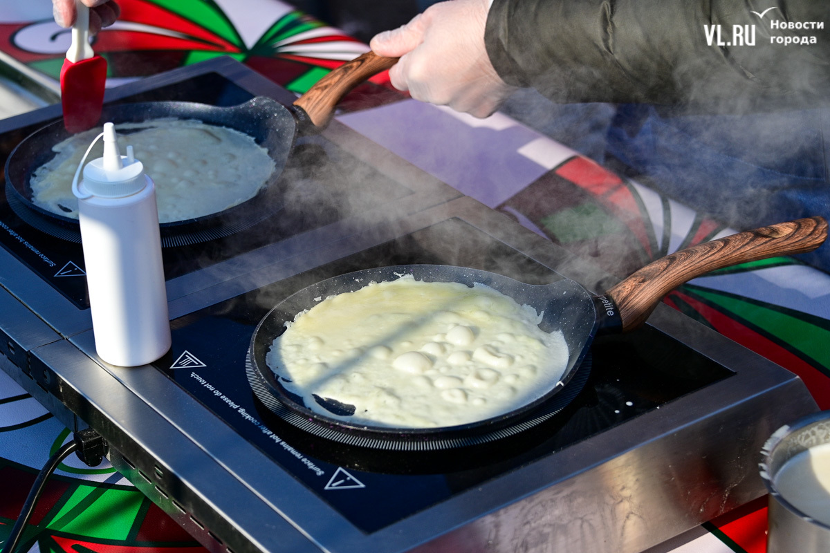 «У нас будет около тысячи порций. И по максимуму желающих должно хватить обязательно. Празднуем дальше вступление в Новый 2025 год. До масленицы нам ещё далеко, такой разогревчик перед масленицей – Visit Primorye решил устроить вот такое событие. А почему бы и нет? Потому что пельмени – это такое традиционное блюдо на новогоднем столе. А блины любят в нашей стране не только на масленицу. Кто не любит блины? Наверное, не найдется такого человека. Желающих очень много», – говорил один из ведущих, семенящий между поварами с гигантскими тарами жидкого теста.