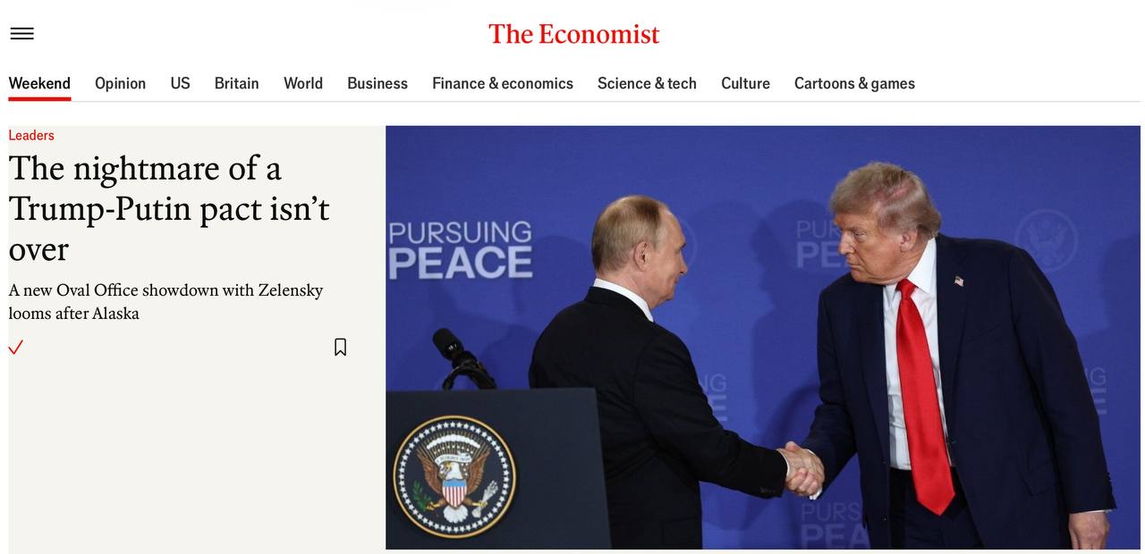 The Economist: «Кошмар пакта Трамп-Путин не закончился». Журнал пишет, что «момент максимальной опасности для Европы еще впереди». И связывает его с тупиком, в котором Зеленский может оказаться в Вашингтоне во время предстоящей встречи с Трампом. Мол, и согласиться на сделку Трампа нельзя, и отказаться от нее - тоже.