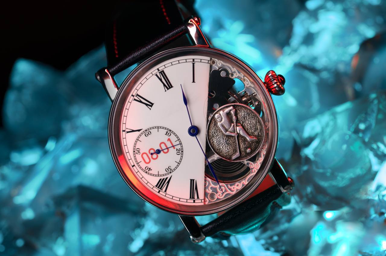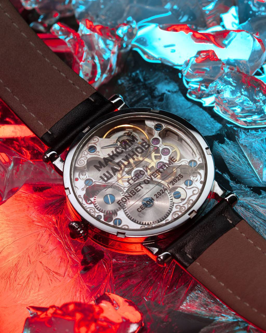 Ну и вот, значит, эти часы изготовил часовой завод «Павелъ Буре» по заказу титульного партнера Fonbet Чемпионата КХЛ. На циферблате указано время решающей шайбы. Кабошон на заводной головке украшен рубином. В прямом и переносном смысле красивый пяр.