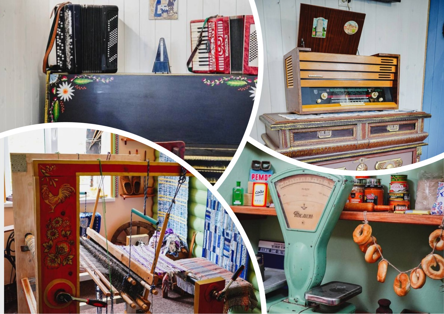 — Здесь вы можете увидеть предметы сельского и советского быта (прялки, самовары, плотницкие инструменты, утюги, швейную машинку «Зингер», чемоданы, сундуки, старинную мебель, советский сервиз «Рыбки»), технику (первую советскую видеокамеру «Старт», плёночные фотоаппараты, диапроекторы, печатные машинки), предметы рукоделия, книги, — сообщил туристический портал региона chel.travel.