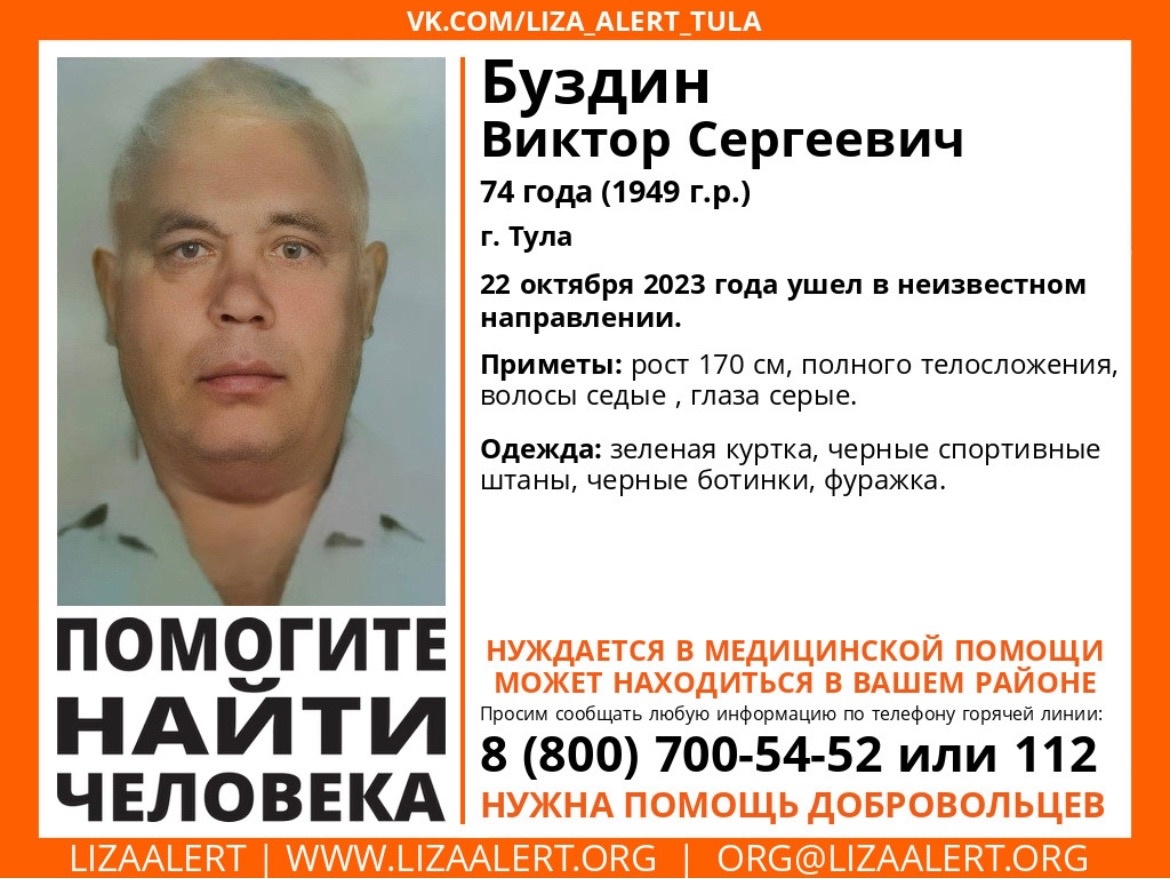 В Туле пропал 74-летний мужчина Буздин Виктор Сергеевич. Его местонахождение неизвестно с 22 октября 2023 года.