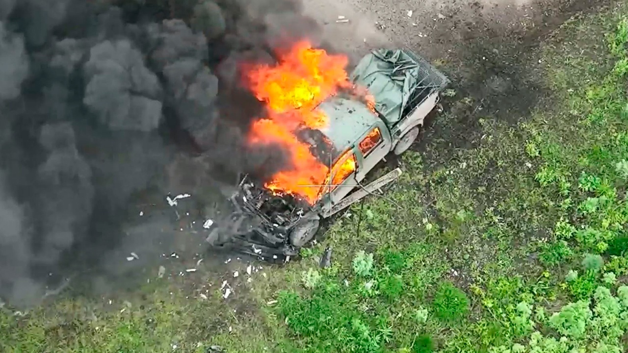 Минобороны показало кадры, которые показывают попадание беспилотника в цель, а потом - горящий пикап.