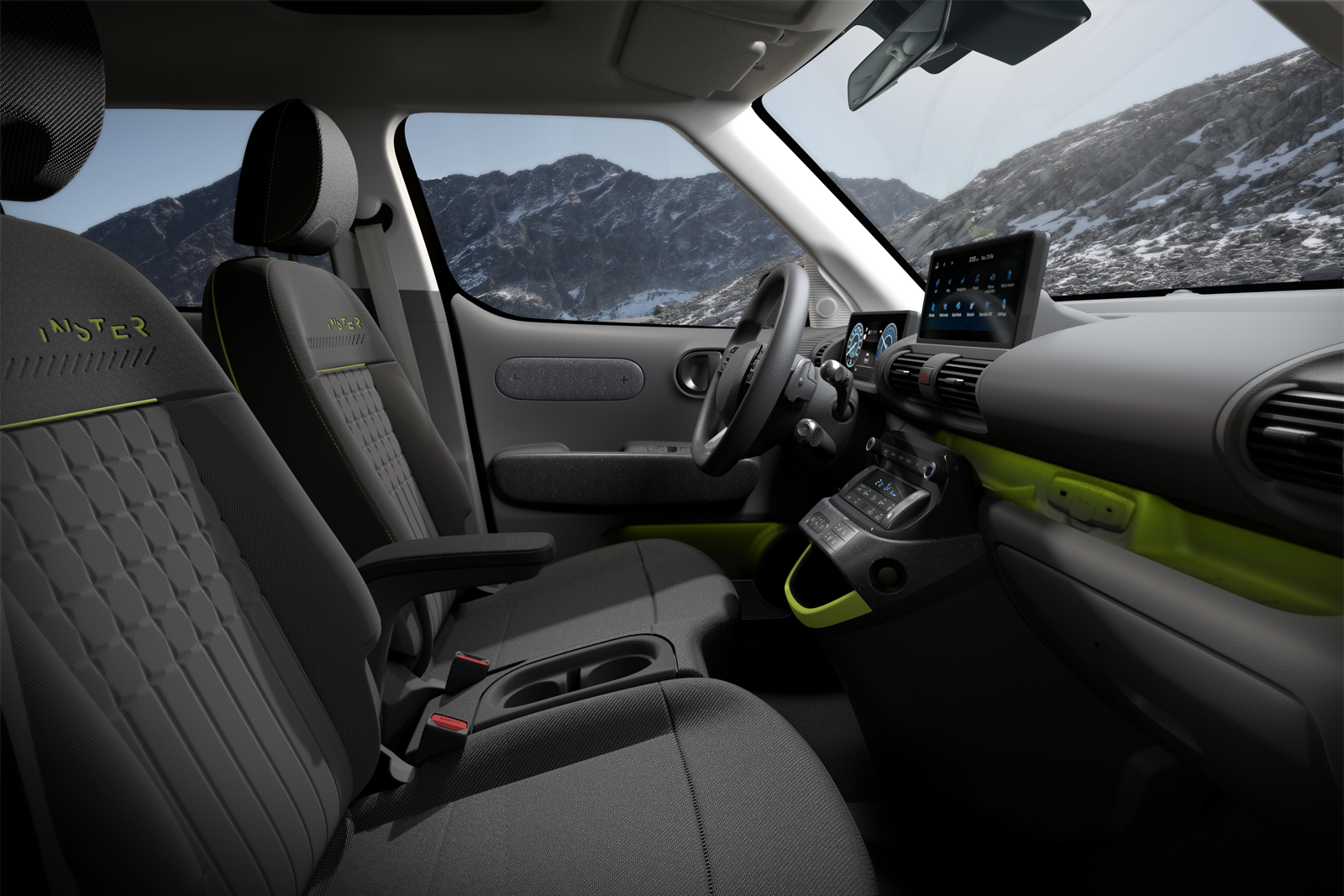 Передние стойки, верх, а также корпуса наружных зеркал окрашены в чёрный, а на крыше находится массивный багажник. Отметим, объём «обычного» грузового отсека варьируется в диапазоне от 280 до 351 литра (в зависимости от версии). Длина Hyundai Inster Cross составляет 3825 мм. Для кросс-версии паркетника предложен особый цвет кузова Amazonas Green Matte, доступный наряду с остальной палитрой, доставшейся от «обычного» Hyundai Inster.