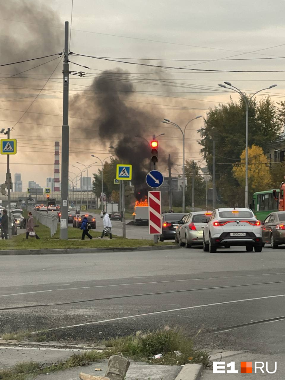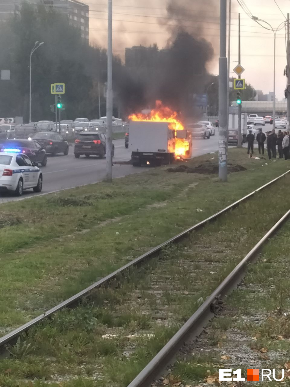 Обновлено. В ГИБДД рассказали, что во время движения у «Газели» произошло замыкание, это и привело к возгоранию.