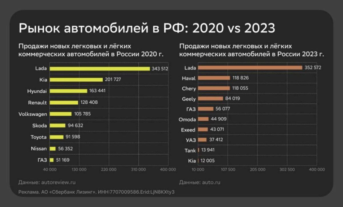 …если не смотреть на цифры, то полное ощущение, что китайские марки разрывают наш рынок как тузик грелку, вчистую выигрывая у отечественных производителей. Но оказывается это совсем не так. Взгляните на статистику. В 2020 году было продано 1 млн 599 тысяч новых легковых и легких коммерческих автомобилей, а в 2023 году лишь 1 млн 149 тысяч. И при этом все наши производители, и АВТОВАЗ, и ГАЗ и УАЗ не снизили, а наоборот даже немного нарастили продажи. И это при том, что 2023 год был все еще сложным, был недостаток комплектующих, Весту еще не успели в первые месяцы перевезти в Тольятти, еще не возобновили производство Ларгуса. И даже несмотря на это, все равно вышли в плюс. А в этом году уже сейчас очевидно, что продажи и доля на рынке еще вырастут, а впереди еще и начало производства Искры и Ауры!