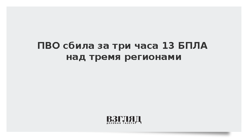 В период с 17:00 до 20:00 по московскому времени средствами противовоздушной обороны были перехвачены и уничтожены 13 украинских беспилотников самолетного типа над тремя регионами, следует из сообщения в Telegram-канале Минобороны.