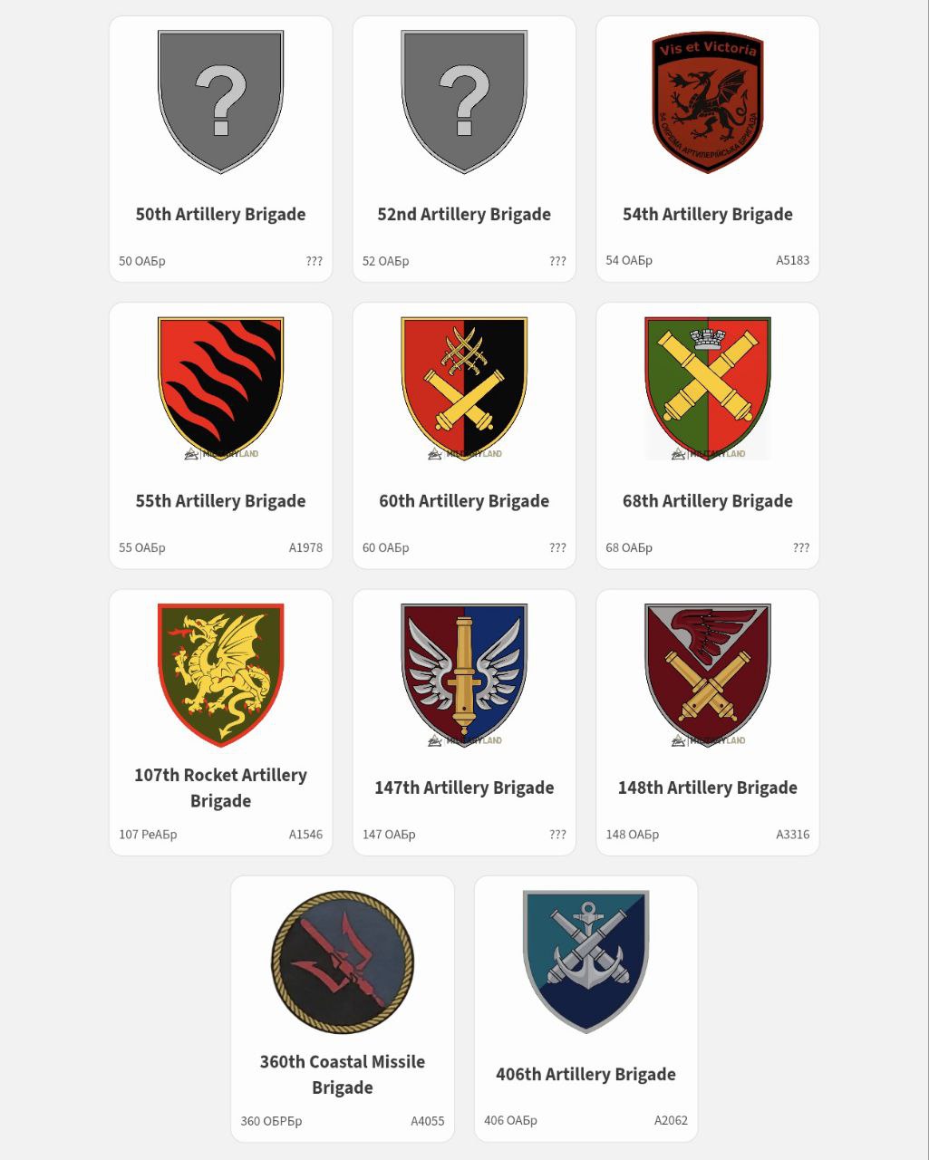 Соединения ракетных войск и артиллерии ВСУ. Среди новых артиллерийских бригад – 50-я, 52-я, 60-я, 68-я, 147-я.