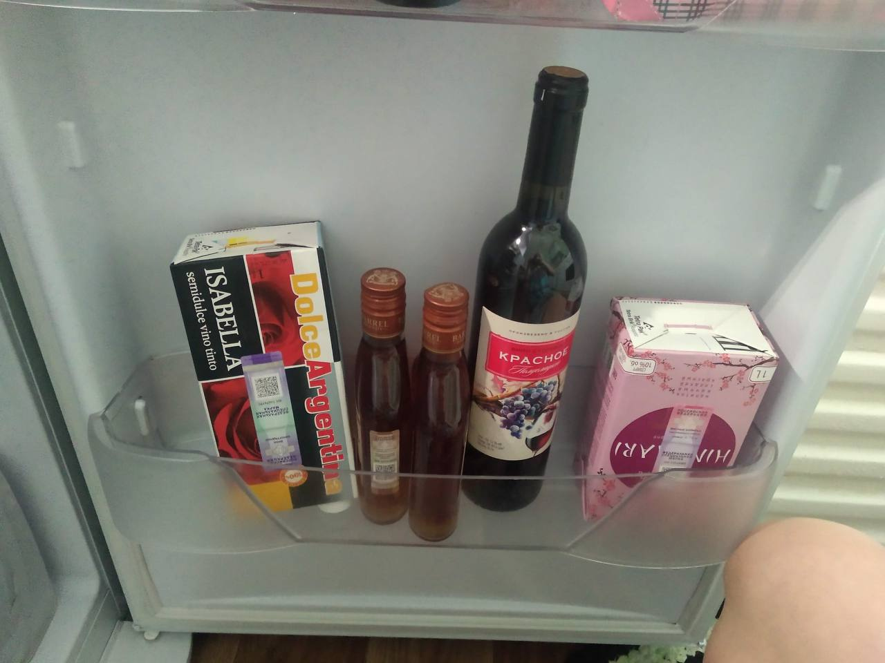 — Я даже не буду его весь фоткать вам: он пустой. В боковом отсеке стоит винишко и бренди. Причем до зарплаты еще неделя — осталось самое бюджетное всё. Скажем так, на черный день, — смущается девушка. Где-то на дне пара зубчиков чеснока завалялась.