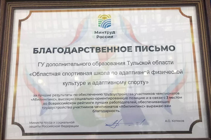 Тульская областная спортивная школа по адаптивной физической культуре и адаптивному спорту получила благодарственное письмо Минтруда России, сообщает региональное минспорта.