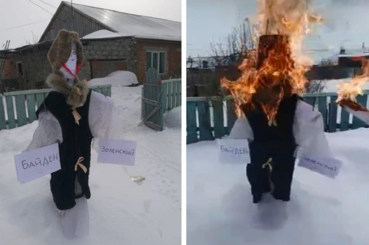 Жители омской деревни Верхний Карбуш на Масленицу отомстили Байдену и Зеленскому. Чучело, изображающее президента США и его украинского коллегу, было сожжено во время празднования.