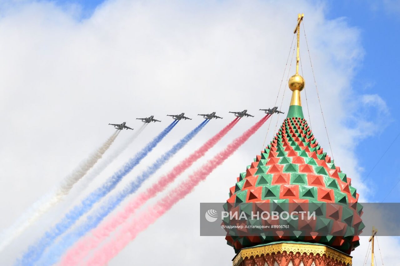 Су-25 и "кубинский бриллиант" из истребителей МиГ-29 и Су-30СМ пилотажных групп "Русские витязи" и "Стрижи" на репетиции воздушной части парада в Москве в честь 80-й годовщины Победы в Великой Отечественной войне.