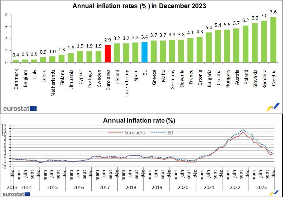 πͺπΊΠΠΎΠ΄ΠΎΠ²Π°Ρ ΠΈΠ½ΡΠ»ΡΡΠΈΡ Π² Π΅Π²ΡΠΎΠ·ΠΎΠ½Π΅ ΡΠΎΡΡΠ°Π²ΠΈΠ»Π° 2,9% Π² Π΄Π΅ΠΊΠ°Π±ΡΠ΅ 2023 Π³ΠΎΠ΄Π° ΠΏΠΎ ΡΡΠ°Π²Π½Π΅Π½ΠΈΡ Ρ 2,4% Π² Π½ΠΎΡΠ±ΡΠ΅