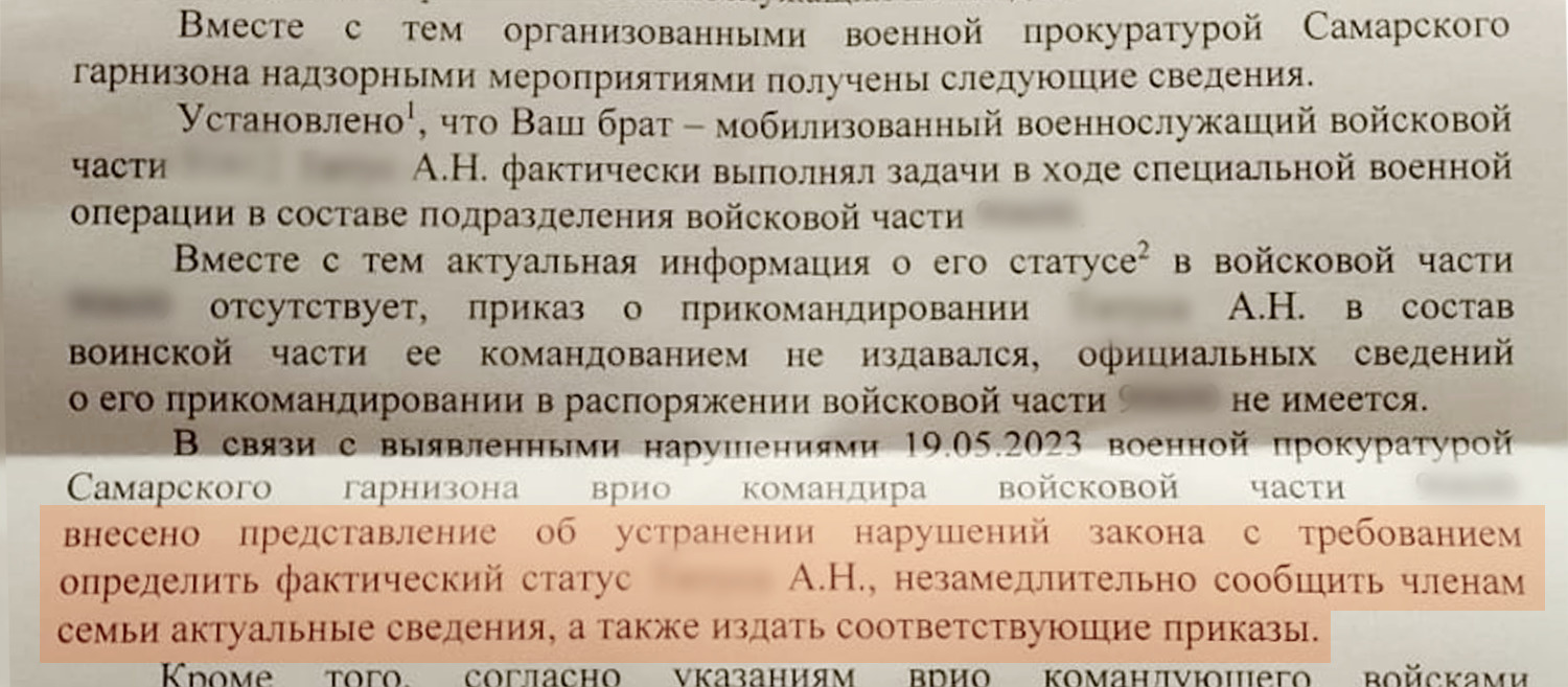 Сестра мобилизованного обратилась с жалобой в военную прокуратуру Самарского гарнизона. Оттуда пришел письменный ответ о проведенной проверке. В ведомстве подтвердили, что военнослужащий действительно выполняет задачи в ходе специальной военной операции в составе мотострелковой бригады из Самарской области, но приказ об этом не издавался.