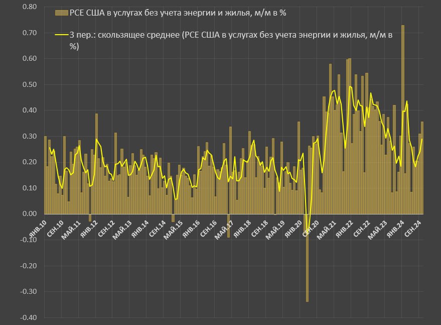 Теперь, что касается темпов инфляции. Отдельно стоит выделить группировку PCE в услугах без учета энергии и жилья – это очень емкая категория, которая включает в себя 10.3 трлн расходов или 51.2% от общих расходов. Есть ли замедление?