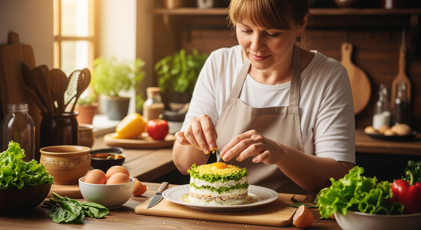 Несмотря на изысканный вид, этот салат готовится всего за 20 минут из доступных продуктов. Его можно подавать в большой салатнице, порционно или даже в стаканах для вечеринки. Если вы хотите сделать салат более легким, замените майонез греческим йогуртом с добавлением горчицы. Для разнообразия можно добавить авокадо или огурцы. Также интересно попробовать приготовить его с красной рыбой вместо печени трески - вкус будет иным, но не менее приятным.