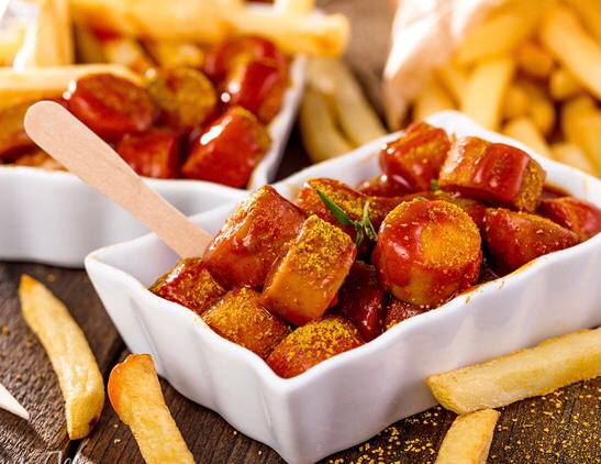 Сервировка: порежьте колбаски, полейте соусом, сверху присыпьте карри. Можно по желанию гарнировать картофелем фри
