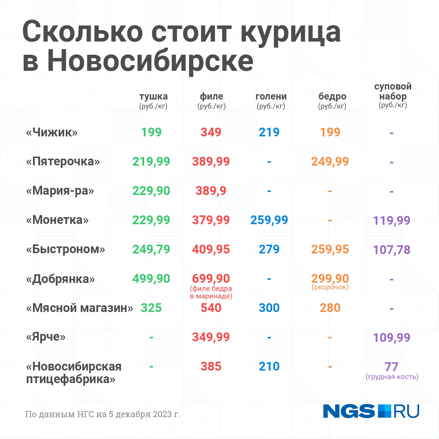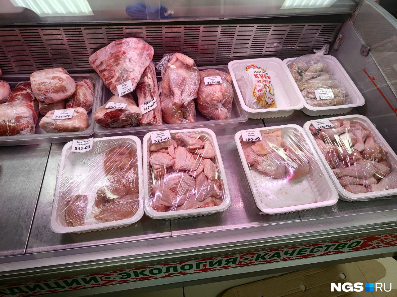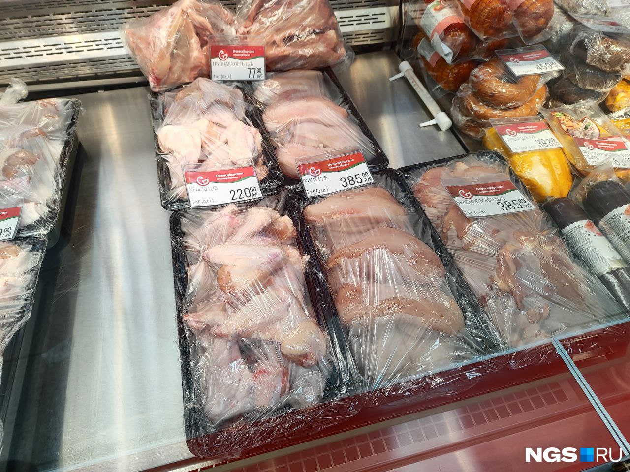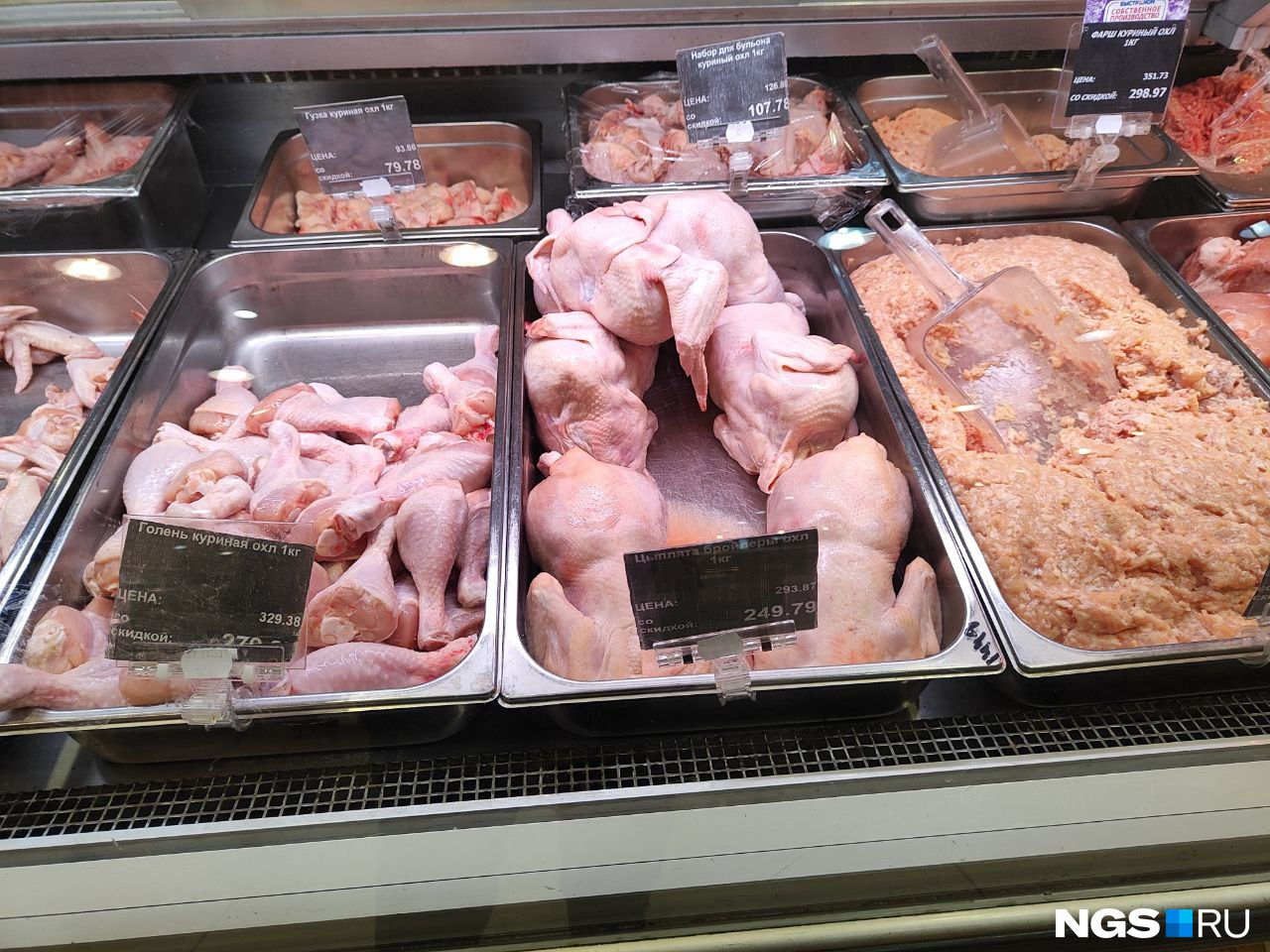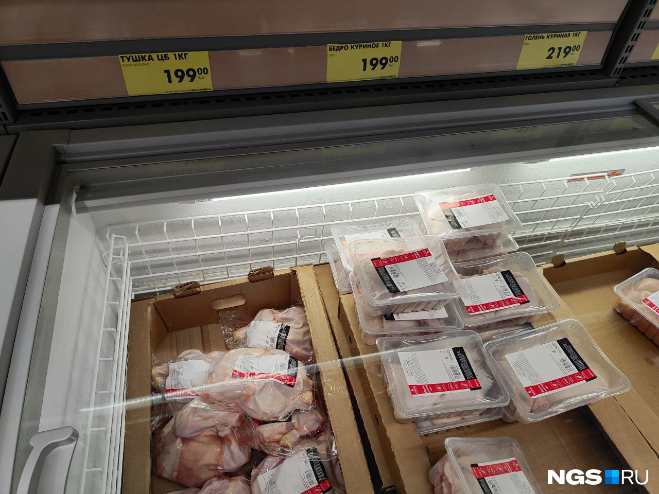 Топ по доступным ценам возглавила недавно открывшаяся в Новосибирске сеть «Чижик». Тушку курицы можно купить по цене в 199 рублей за килограмм. Для тех, кто боится, что птица и мясо свалены в кучу как попало, спешим успокоить: оно лежало в холодильнике, а не посередине магазина.