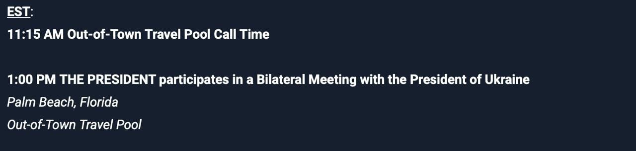Встреча президента США с главарем киевского режима во Флориде состоится раньше запланированного времени. Как сообщили в Белом доме, она начнётся в 21:00 по московскому времени вместо ранее объявленных 23:00.