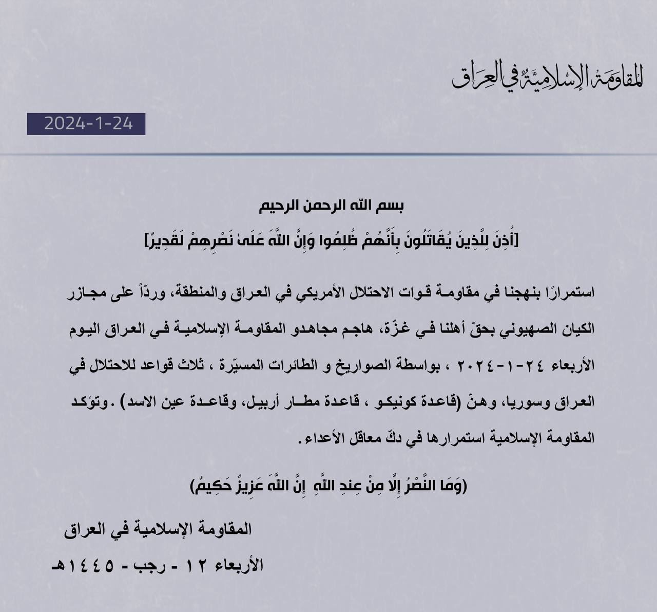 🇮🇶✖️🇺🇸 «Исламское сопротивление в Ираке» сегодня атаковало три военные базы США на Ближнем Востоке
