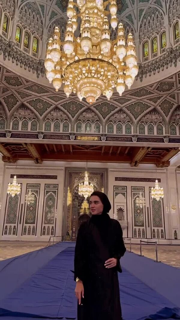 После отдыха в отеле семья отправилась на экскурсию по достопримечательностям. Звезда засняла вид королевского дворца Каср Аль-Алам, ломящиеся от специй и фруктов прилавки восточного рынка, но особый восторг у нее вызвала мечеть султана Кабуса.