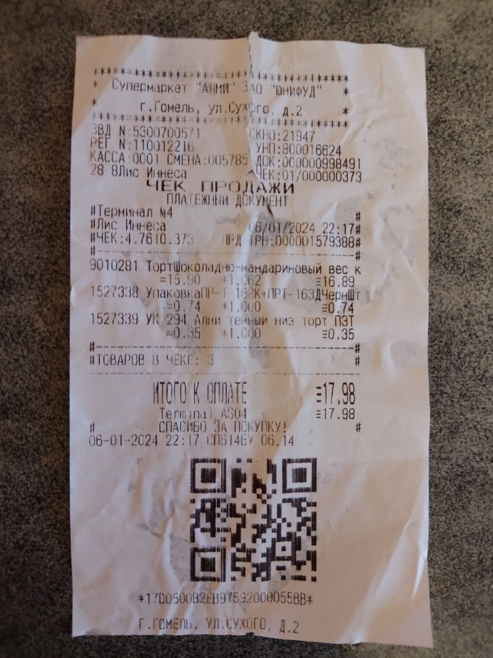 Сергей на днях заглянул в гомельский супермаркет и купил торт. Вроде бы ничего необычного, торт как торт, но при расчете на кассе его цена выросла на рубль, так как упаковку посчитали отдельно. В чеке было три позиции: сам шоколадно-мандариновый красавец, прозрачная часть упаковки (верх) и темная часть упаковки (низ). Ценник на торте был 16,89 рубля. Еще на упаковке было два штрихкода, но без указания цены. На кассе парень отдал 17,98 рубля — таким образом, упаковка обошлась ему в 1 рубль 9 копеек. «Проблема в том, что объявления о том, что упаковка не входит в стоимость торта, не было. Хочется услышать мнение юриста, кто прав в этой ситуации?»