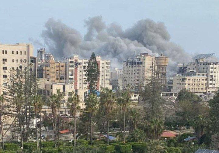 Израильская авиация наносит удары в окрестностях медицинского комплекса Аль-Шифа в секторе Газа.