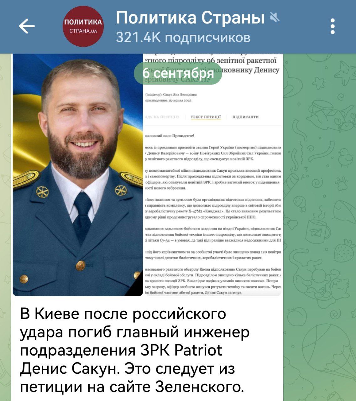 Пока Зеленский рассказывает об ударах "по гражданским объектам в Киеве", случилось неудобное — родственница убитого подполковника подала петицию, в которой рассказала о его смерти в результате прилёта ракеты на позицию ЗРК и потребовала присвоить ему "героя Украины".