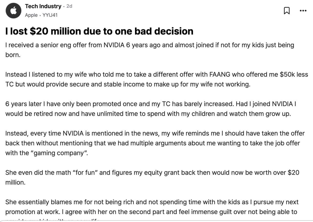 Сотрудник Apple пожаловался, что зарабатывает всего 800 тыс. долларов в год и накопил какие-то жалкие 4.6 млн. долларов, а если бы пошёл в Nvidia, то получил бы более 20 млн. долларов в виде акций. Как заявляет сам сотрудник, в Apple посоветовала устроиться его жена. @banksta