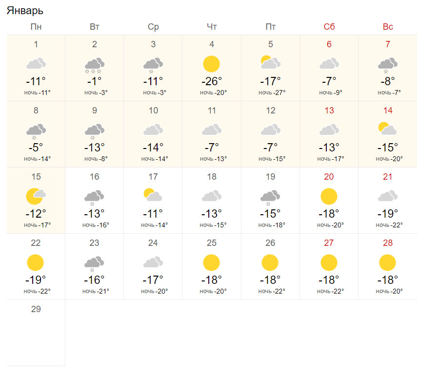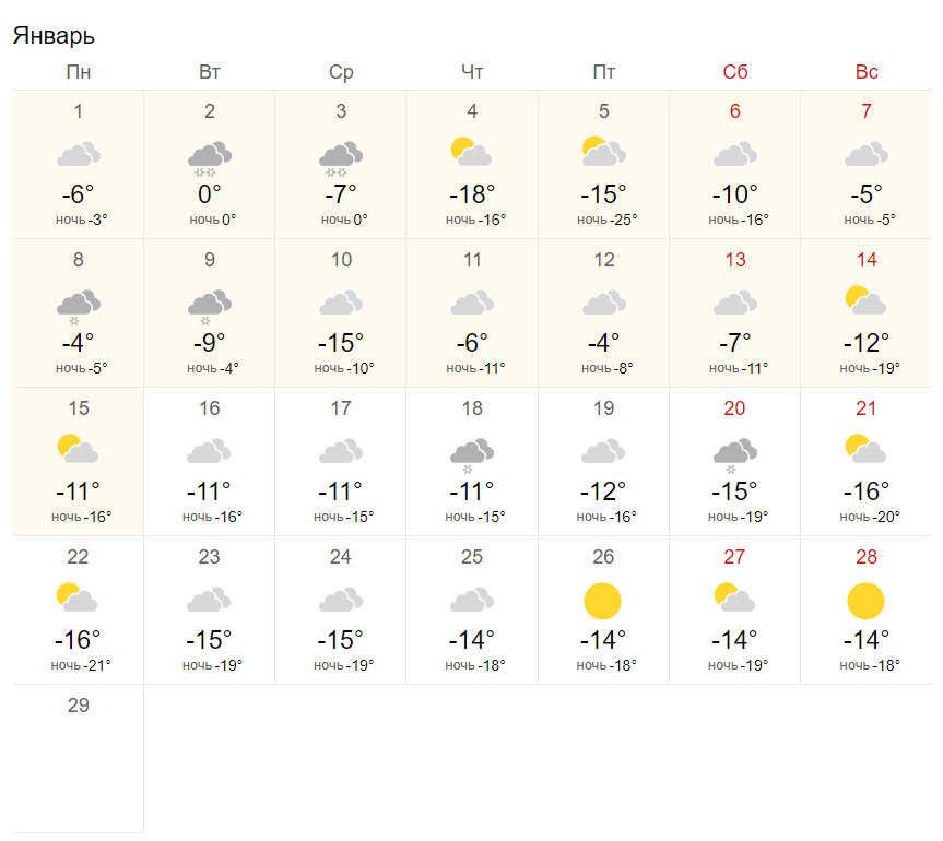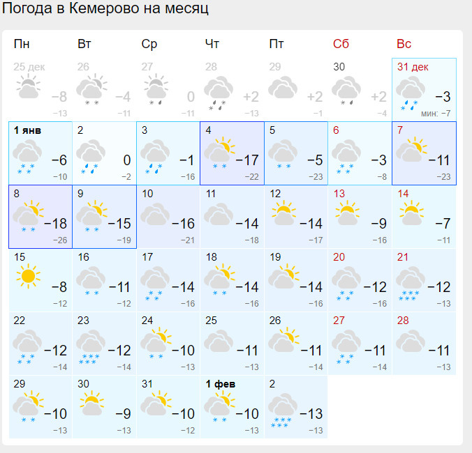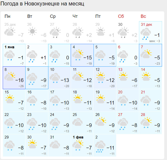 Ситуация в Новокузнецка примерно такая же, но, как и говорилось чуть выше, в южной столице будет немного теплее. Первая неделя января тоже будет довольно нестабильной: от +1 до