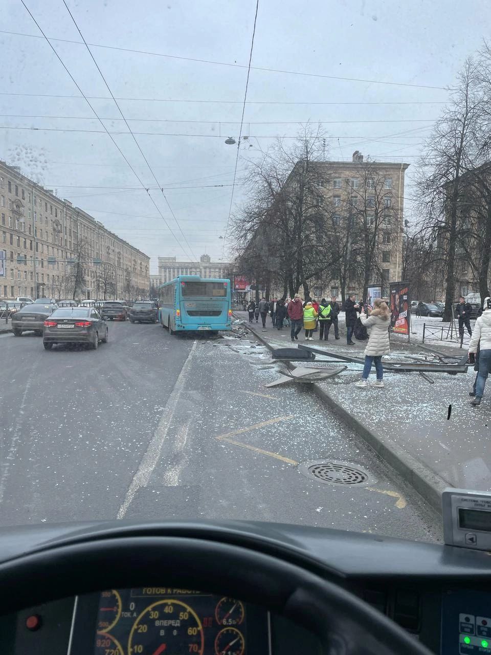 Как рассказал источник, автобус поворачивал с Ленинского на Варшавскую на достаточно высокой скорости, его занесло, и он врезался в машины. После этого общественный транспорт протаранил два ограждения и вылетел на остановку, где стоял автобус №13. В итоге первый автобус снёс павильон и врезался во второй автобус.
