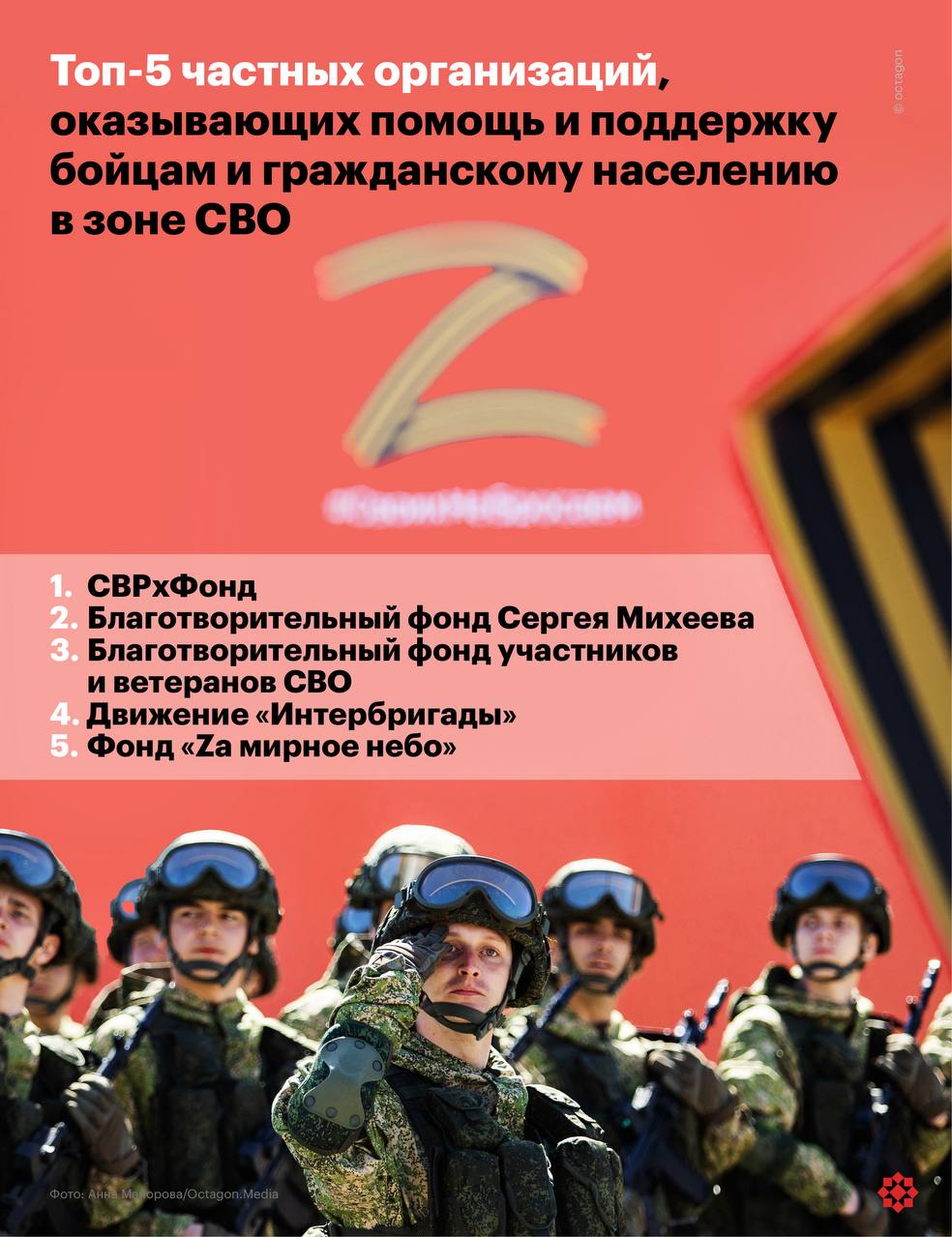 Помощью российским военным занимаются организации, созданные как бывшими участниками СВО, рядовыми гражданами, так и публичными известными личностями. Одной из крупнейших благотворительных структур является зарегистрированный 7 октября 2022 года «СВРхФонд» журналиста и телеведущего Владимира Соловьёва.