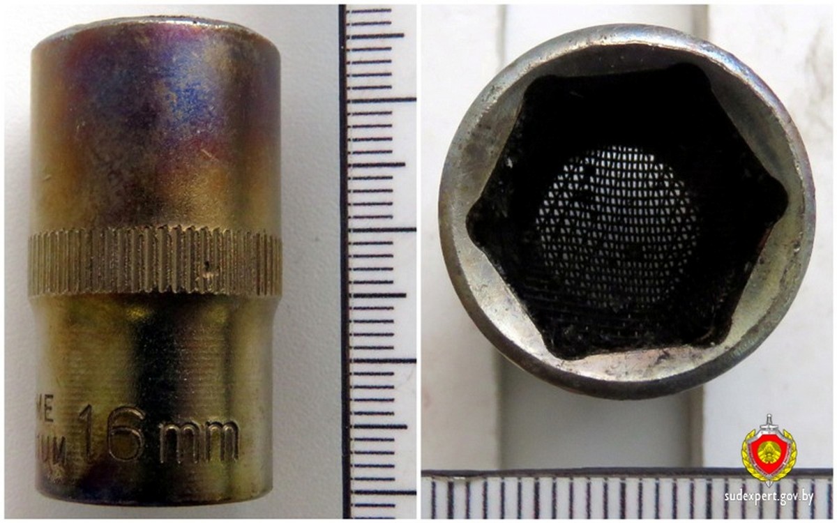 В ходе осмотра гаража сотрудниками милиции обнаружена металлическая головка торцевого ключа с наслоениями вещества темного цвета.