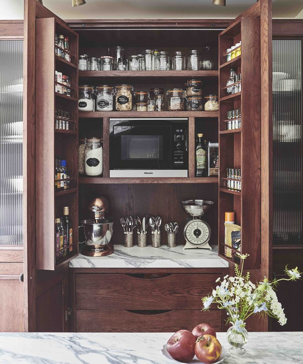 Если в доме достаточно высокие потолки — это отличная возможность организовать аккуратное хранилище. В одном из недавних проектов (таунхаус в Хэмпстеде) я спланировала кухонный шкаф высотой до потолка, который занимал половину стены. Внутри него оборудована вместительная двустворчатая кладовка — удобное приспособление для размещения малой бытовой техники, различной кухонной утвари, организованного хранения приправ и специй в одном месте.