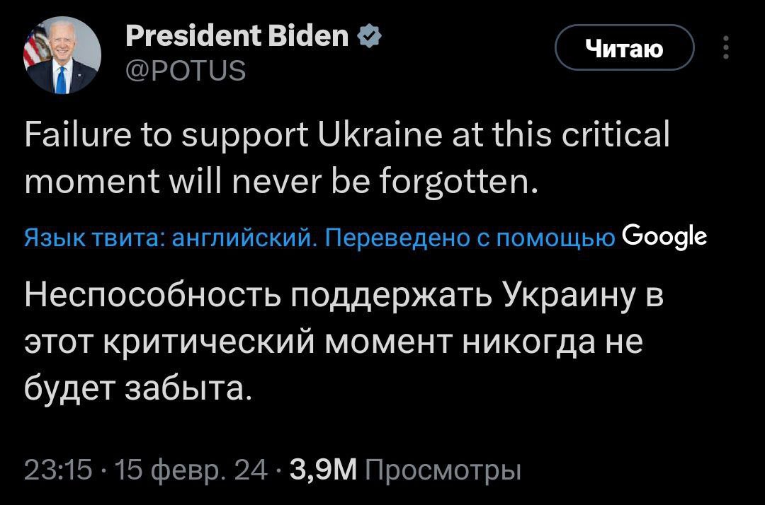 Также высказался и сам Байден. Он заявил, что "неспособность поддержать Украину в этот критический момент не будет забыта".
